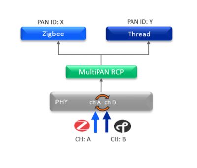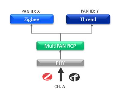 By sharing the 802.15.4 PHY and MAC layers, and with Zigbee and Thread operating on the same channel, this feature enables the device to concurrently receive Zigbee or Thread packets using a single radio (and no time slicing). It achieves the differentiation between the protocols through the unique PANID associated with each protocol stack, a functionality referred to as the Multi-PAN feature.