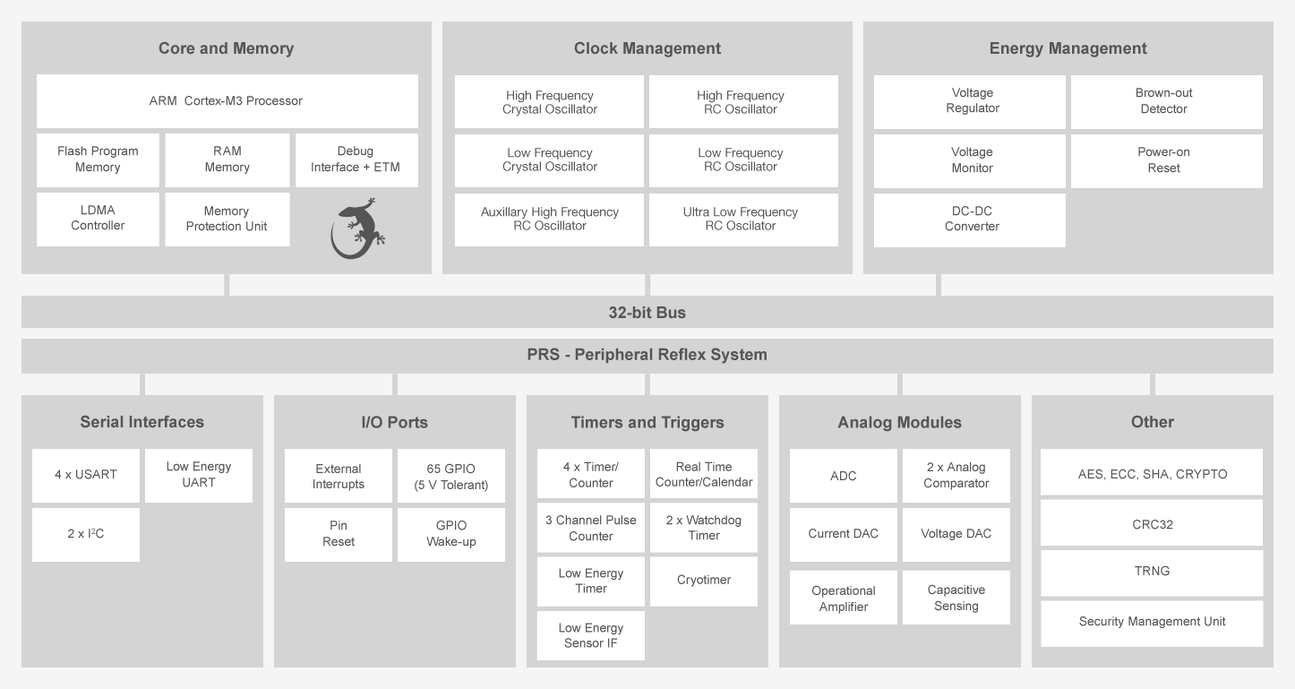 - 64 μA/MHz in Active Mode (EM0)