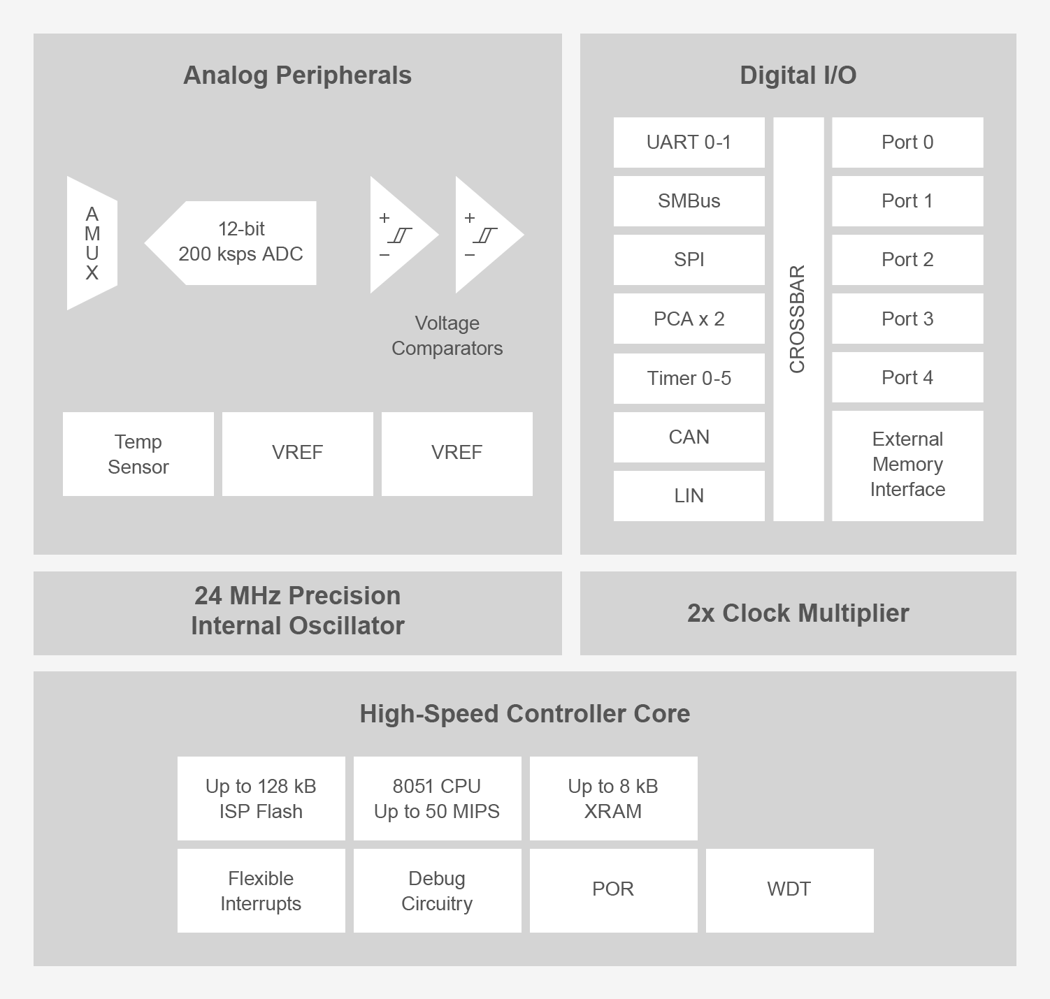 | 8051 | 50 | 32 | 4.25 | 33 | Yes | 12-bit, 32-ch., 200 ksps | No | Yes | 4 | 6 | — | — | 2 | 1 | 1 | 1 | 0 | 0 | 1 | 0 | 0 | No | Yes | 1.8 | 5.25 | QFN40 | 6x6 | ±0.5 | Yes | C2 | -40 125 — |