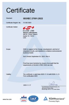 Our commitment to security is validated by our ISO 27001:2022 certification. This certification confirms that our security practices comply with one of the world's most rigorous international standards for information security managemnet. Siliocn Labs is ISO 27001:2022 certified with TÜV Rheinland of North America.