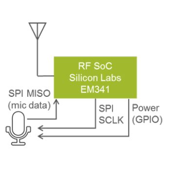 Voice audio requires 256 kbps throughput. Zigbee has a data rate of 256 kbps but the actual throughput is typically 100 kbps or less for a point-to-point link. This means that 4:1 compression is needed on the audio before sending it over the air. The reference design uses a hardware codec, mic, and voice capability. However, the RF SoC EM341 also supports a software codec that can provide significant cost savings with no feature reductions. The software codec is based on connecting the digital PDM (pulse density modulation) microphone directly to the EM341’s SPI and GPIO pins as shown in Figure 6.
