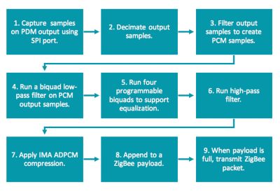 The EM341’s Cortex M3 handles the PDM to PCM (pulse code modulation) filtering/decimation, equalization, and compression processes. The complete procedure from PDM output to Zigbee transmit is shown in Figure 7 and provided as a free library for the Silicon Labs zigbee Remote Control application profile.