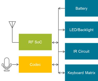 Adding voice capability to a remote can double the bill-of-materials (BOM) cost of a standard RF remote control. A voice-enabled remote needs to support RF, add a microphone and codec, and include supporting circuitry.The following examples show block-diagram comparisons between IR, RF and RF+Voice. The IR-link capability always remains in each remote control, with RF or RF+Voice and associated BOM differences shown.