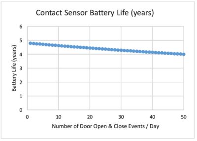 When considering the operation of a sensor, developers can estimate battery life based on the applications themselves. For example, with a contact sensor used to detect an open window or an open door, the main sensor is a reed switch that detects the presence of a nearby magnet to determine if an entry point is open or closed. Once a magnetic field reaches a certain threshold, the sensor assumes the entry point status has changed and a wireless transmission is initiated.