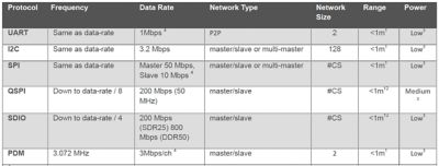 There are many types of internal connections, and their properties depend on their use-cases. An overview of some internal connectivity technologies is shown in Table 3. Note that external connectivity technology is sometimes used inside an application as well. One example is USB, which is sometimes used to connect multiple sub-systems of an application together. In that scenario, a slightly different specification, sometimes referred to as USB-IC, is used, which reduces the overhead of standard USB. This section will not focuson those technologies, but rather the more common ways of connecting devices together in an embedded IoT application.
