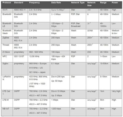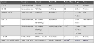 Both wired and wireless technologies have their benefits and downsides, and which you should use depends fully on the target application. For large installations, there is also a cost factor related to wired connectivity because the cables must be purchased and installed. The choice must be looked at from all angles.The table below shows some of the wireless options available on the market today. This list is by no means exhaustive, and on top of the communication protocols below, there are higher-level standards that define how to communicate.