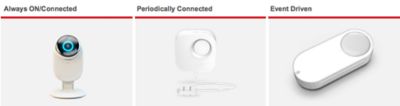 - Always On/Connected - These devices are always-on in the sense user can access the device any time remotely via cloud and mobile app. A good example is a battery powered Wi-Fi video camera. Latency is a critical factor in these applications. Power consumption is dominated by the Transmit power as the device will be transmitting video.