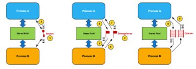 - Alternatively, communication can use an RTOS’s message queue mechanism. In this case, a buffer from dynamically allocated memory is obtained from the shared RAM area (the buffer needs to be accessible by both processes). The sender task in Process A fills the buffer and sends a pointer to a task in Process B.