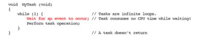 Most commercial RTOSes are preemptive, which means that the kernel always runs the most important task that is ready-to-run. Preemptive kernels are also event driven, which means that tasks are designed to wait for events to occur to execute. If the event that the task is waiting for does not occur, the kernel runs other tasks. Waiting tasks consumes zero CPU time. Signaling and waiting for events is accomplished through kernel Application Programming Interfaces (API) calls. Kernels allow you to avoid polling loops, which would be a poor use of the CPU’s time. Below is an example of how a typical task is implemented: