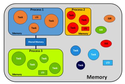 With the help of an MPU, RTOS tasks are grouped into processes, as shown below. Each process can consist of any number of tasks. Tasks within a process are allowed to access memory and peripherals that are allocated to that process. However, a task doesn’t know that it’s part of the same process except for the fact that it is given access to the same memory and I/Os as other tasks within the process. When you add an MPU, very little has to change from a task’s perspective since your tasks should be designed in such a way that they don’t interfere with each other unless they have to.