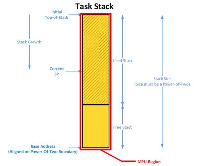 - An MPU region is used to detect stack overflows. As previously mentioned, this method assumes that tasks within a process don’t share data through their stacks. Again, code execution would be disallowed in this region. The RTOS is responsible for selecting which task is allowed to run and, therefore, which task stack will be wrapped in an MPU region.