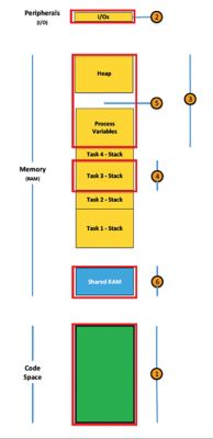 The diagram on the next page shows the regions defined for a process containing four tasks. Only the memory associated with the process is shown. Other processes have their own memory areas, although, in most cases, they will all share the same code space (i.e., flash).
