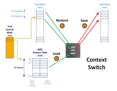 The process table is typically assigned to a task when the task is created. The RTOS keeps a pointer to the process table in the Task’s Control Block (TCB). An RTOS context switch now includes additional code to update the MPU with the process table of the task being switched-in, as shown below. You will notice that the MPU configuration doesn’t need to be saved when a task is switched-out since the configuration for the task is always loaded from the process table, which is typically placed in ROM (i.e., flash).