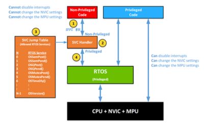 - The desired RTOS service is executed (in privileged mode), and, upon completion, the RTOS returns to the non-privileged code.
