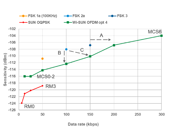 The chart above shows all the PHYs that we have discussed at length. When you look at the OFDM (Option 4) vs FSK use case for these regions, three conclusions can be drawn (shown above as A, B, and C). When we look at case A, you can see that with a similar receive sensitivity or range, OFDM can offer a 30 to 50% increase in data rate. When we look at case B, you can get a roughly 4 dB sensitivity improvement at the same data rate resulting in a significant point-topoint range extension. And lastly, case C combines both A and B into a single example. When looking at FSK 2a, OFDM Option 4 MCS 4 can give a 50% data rate improvement and a 2 dB sensitivity improvement resulting in both higher throughput and increased range.