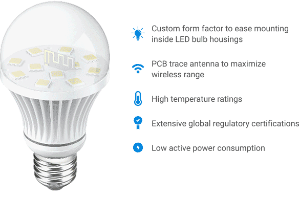 xGM210L modules combine a custom form factor to ease mounting inside LED bulb housings, PCB trace antenna to maximize wireless range, high temperature ratings, extensive global regulatory certifications and low active power consumption, delivering the perfect wireless solution for cost-sensitive, high-volume smart LED lightbulb.